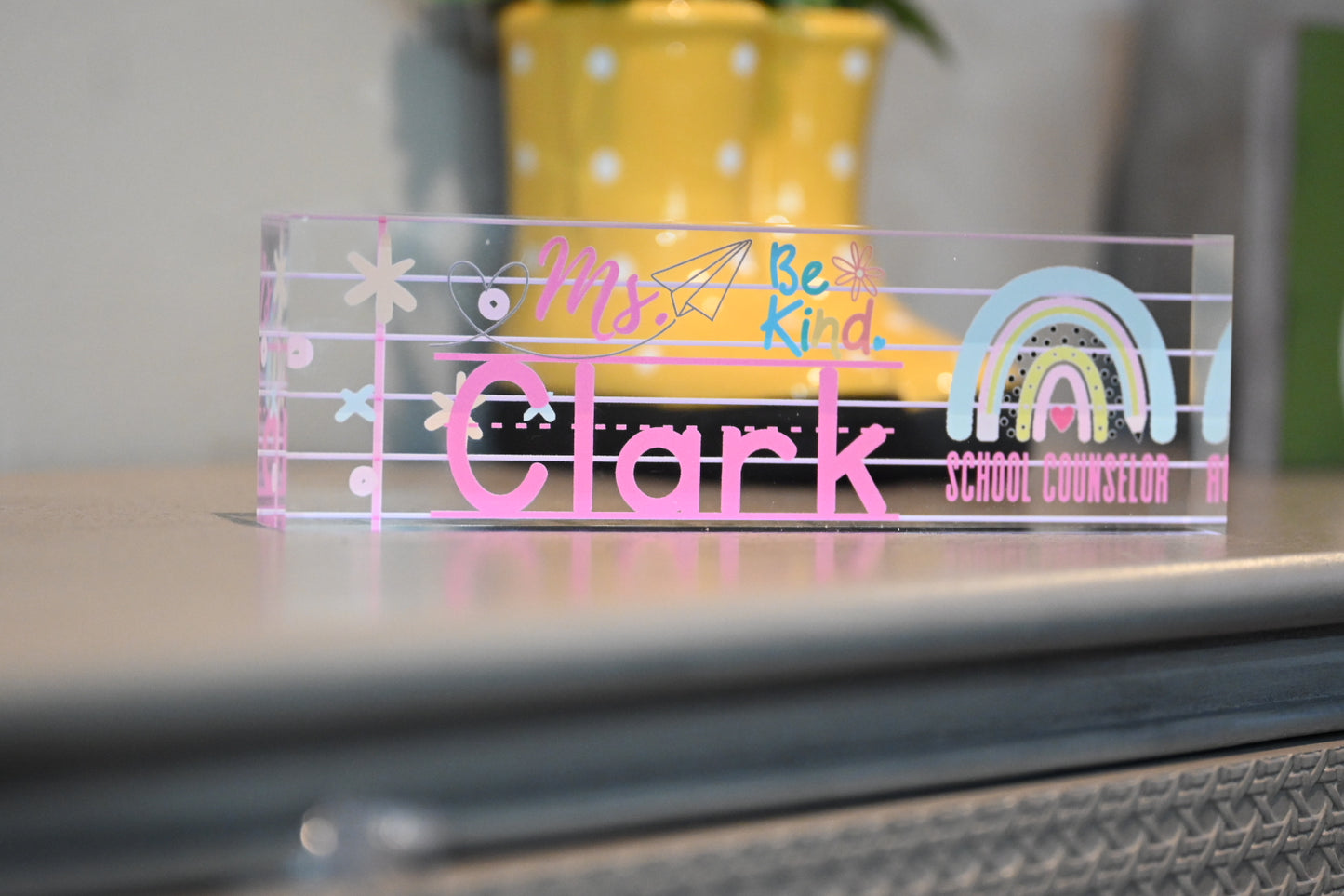 - Elevate your classroom decor with our Teacher Acrylic Desk Plaque, a vibrant desk sign that adds a pop of color to any learning environment